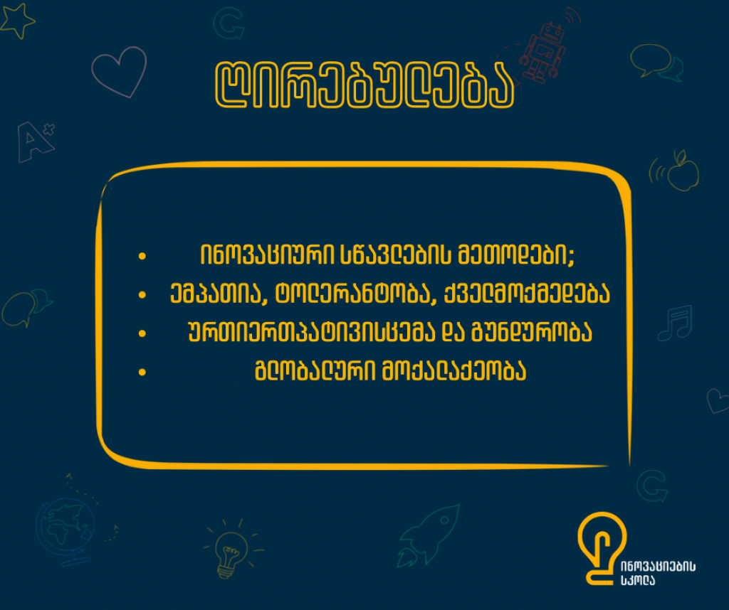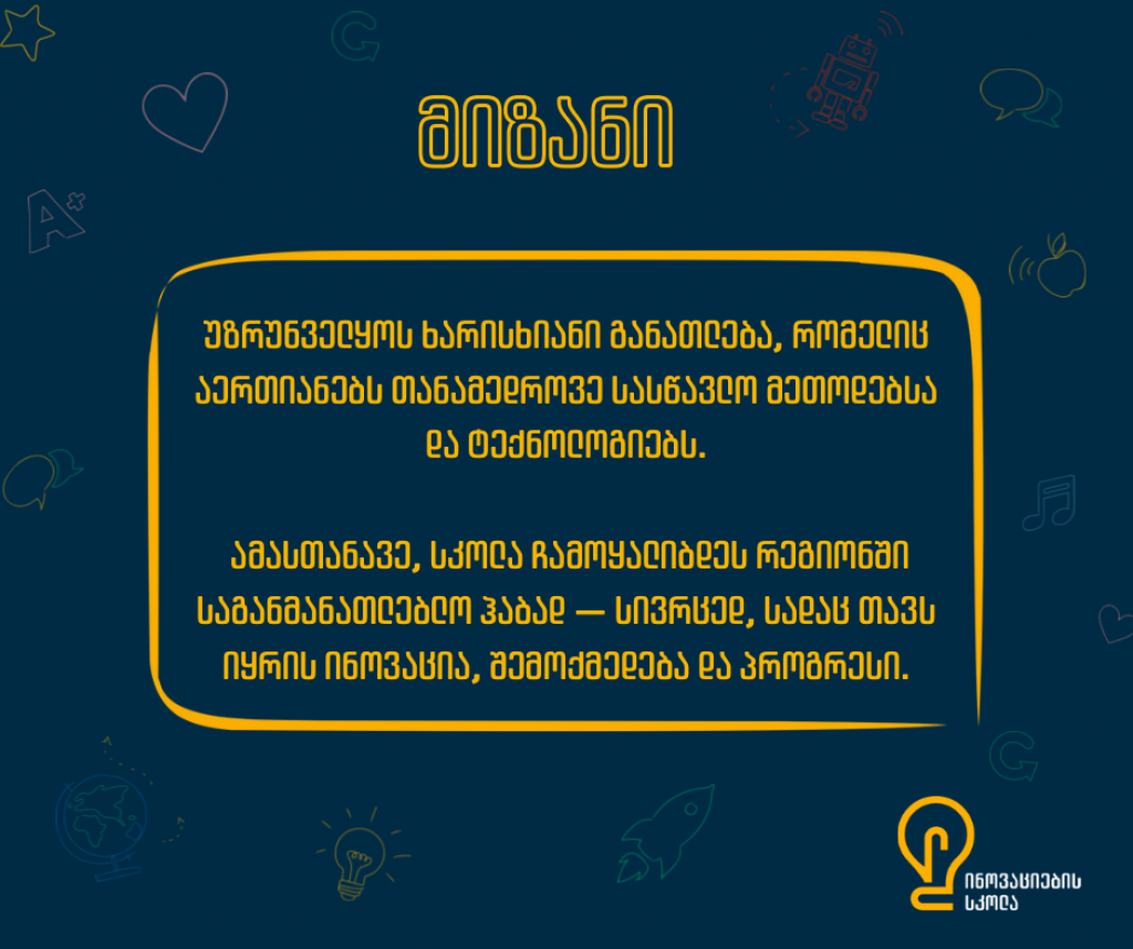 ამასთანავე, სკოლა ჩამოყალიბდეს რეგიონში საგანმანათლებლო ჰაბად — სივრცედ, სადაც თავს იყრის ინოვაცია, შემოქმედება და პროგრესი.