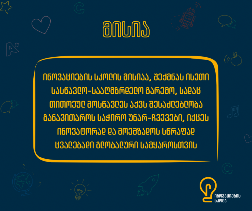 ინოვაციების სკოლის მისიაა, შექმნას ისეთი სასწავლო-სააღმზრდელო გარემო, სადაც თითოეულ მოსწავლეს აქვს შესაძლებლობა განავითაროს საჭირო უნარ-ჩვევები, იქცეს ინოვატორად და მოემზადოს სწრაფად ცვალებადი გლობალური სამყაროსთვის